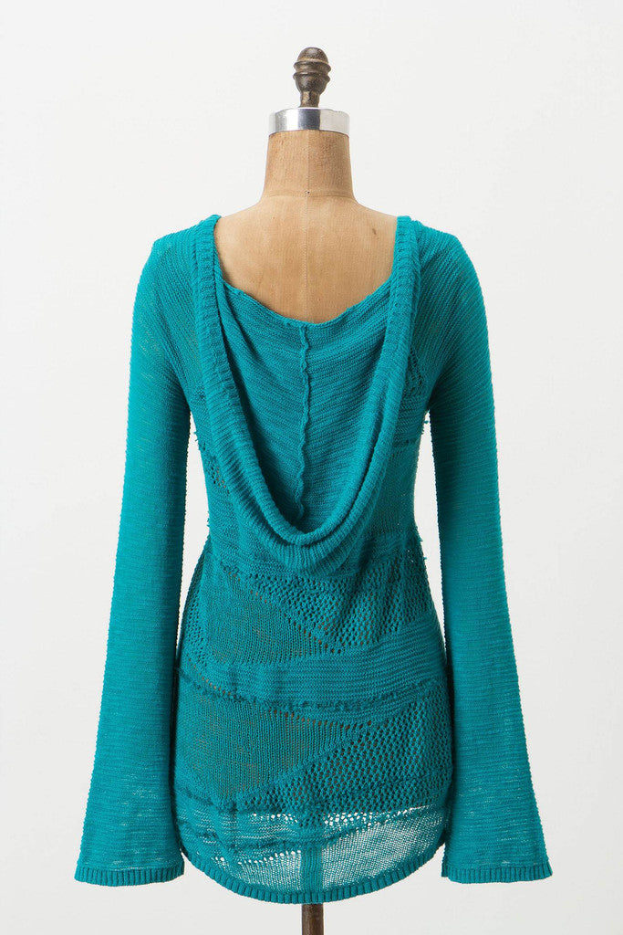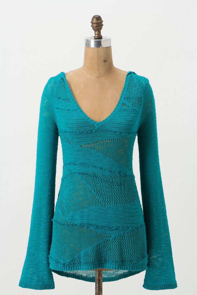 Wedges of openwork are knit into Yellow Bird's lightweight, graduated hem v-neck.
